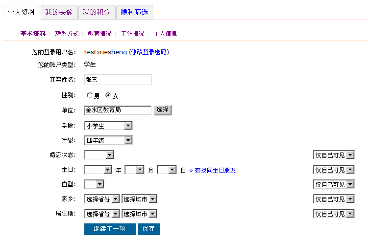 登录后,在页面头部有“设置”的链接,点击后进入个人设置页面,在这里,您可以设置自己的基本资料,联系方式,教育情况,工作情况,个人信息。