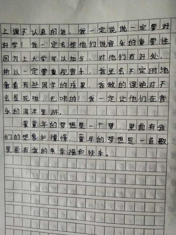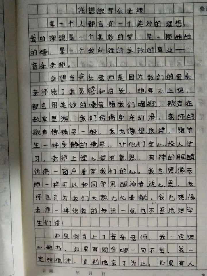 按一定顺序写了自己要当音乐老师的原因,很有真情实感,重点突出,语言朴实,语句通顺连贯,结尾充满对美好未来的憧憬。