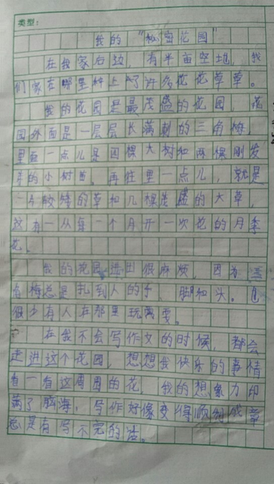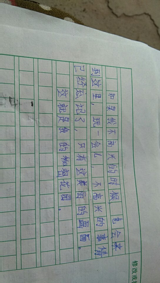 秘密花园,心灵驿站。语言流畅,条理清晰。但文章“秘密”的地方,与内心形成的共鸣,表现的还不够,继续努力呀!!!!