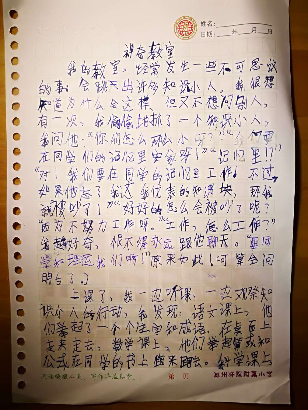 故事新奇,富有感情色彩,写出小作者对“神奇教室”的憧憬与喜爱。