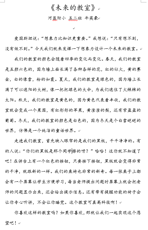文章开头引用了爱因斯坦的话,能够学以致用,这是你的优点。丰富的想象力,神奇的教室,令人向往。只是教室里的四季变化会不会使同学们分心呢?
