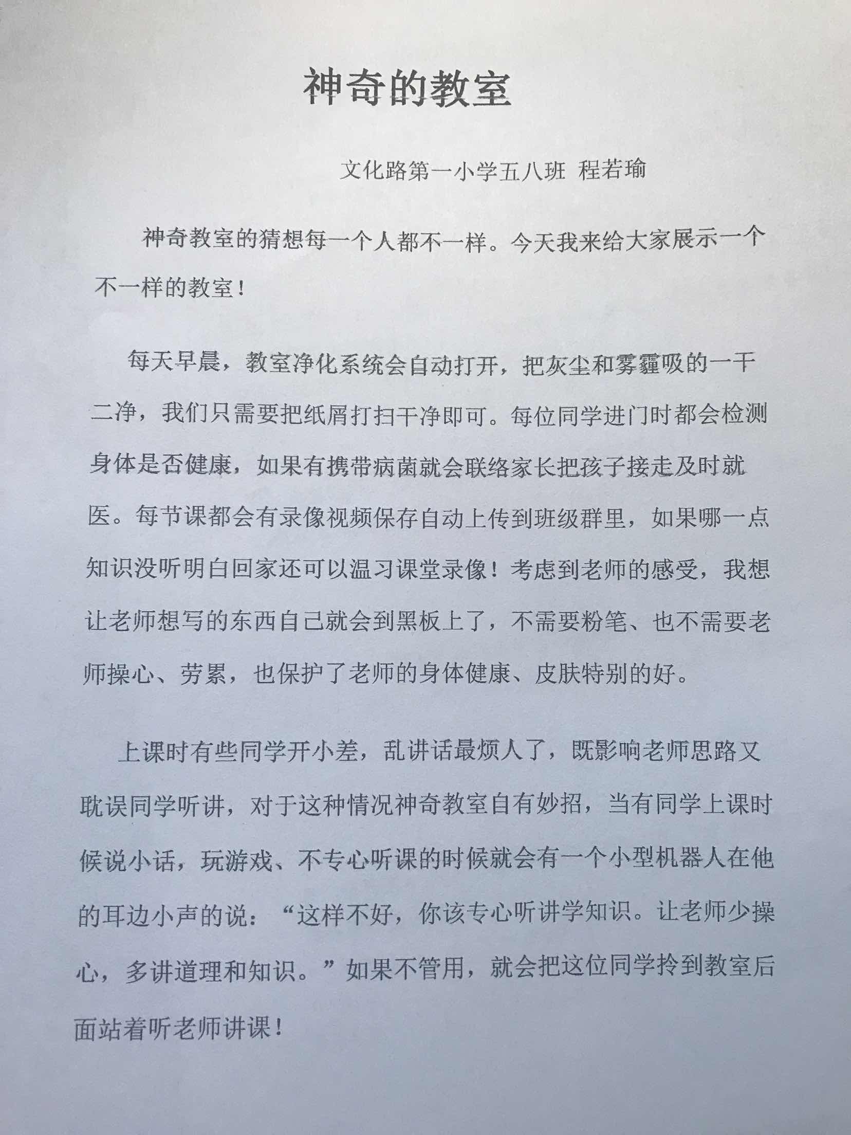 | 小作者展开想象的翅膀,为我们展现了自己希望中的未来教室的模样。这个教室不仅设施齐全、现代化,还考虑的十分全面,既方便了学生,该给老师的工作带来了方便。能有这样一个教室,我想大家都会开心的。 |