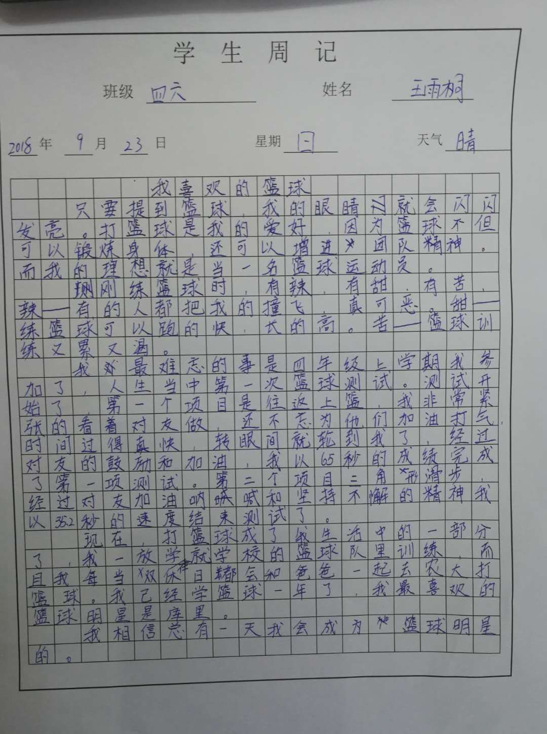 你秀气的字体,你不说根本就看不出你是爱打篮球的小女孩。你这么喜欢篮球,老师也希望你早日成为女篮明星。