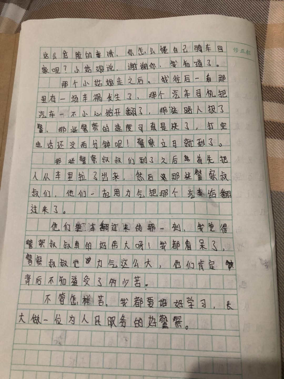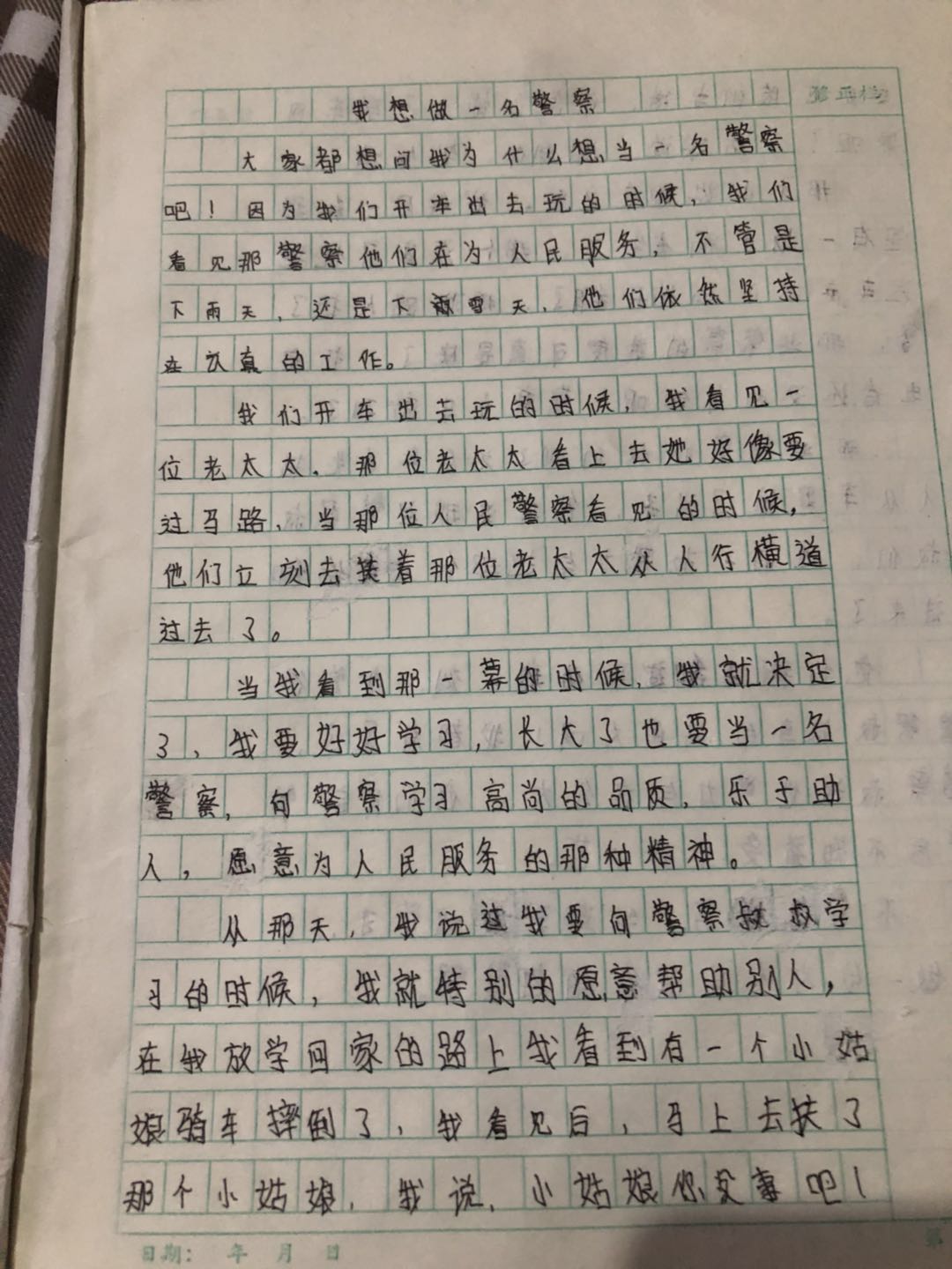 习作使用流畅的语言写出了警察的伟大,警察对自己的深远影响,并表达出自己也要当一名警察的愿望,合情合理,没有一点牵强附会。