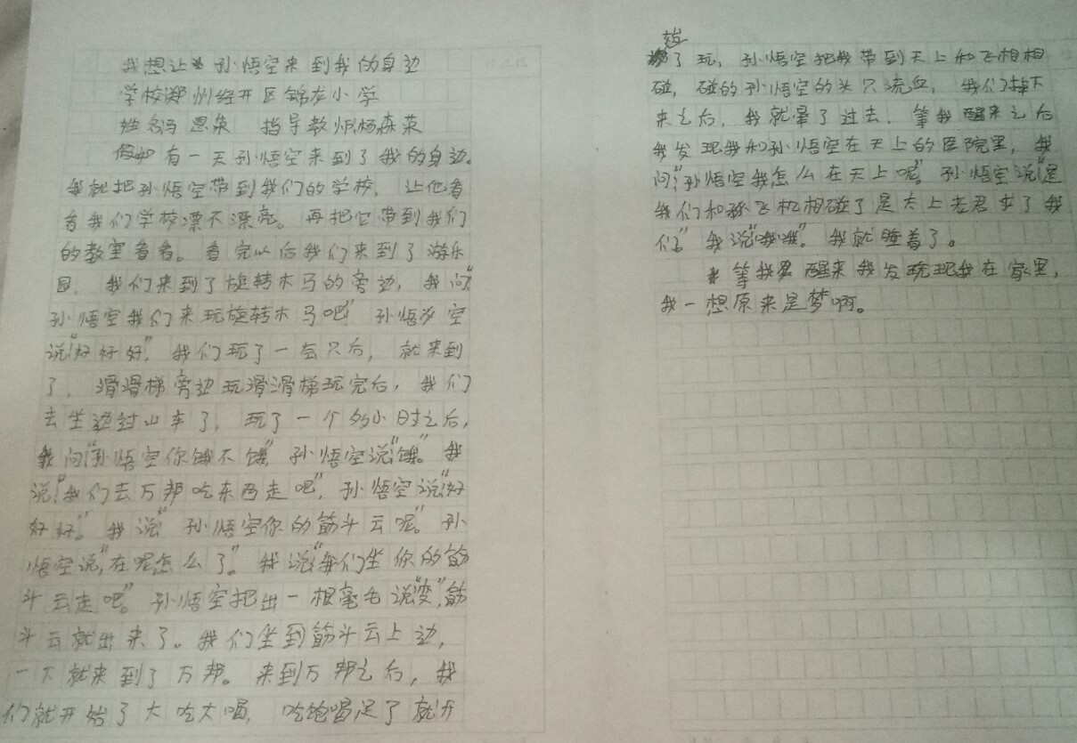 | 文章写的生动有趣,把孙悟空和你写成了一对活宝。你们玩儿了那么多好玩儿的,还吃了好吃的。让人一读像身临其境一样。最后却说是个梦,结尾也是别致。作文写的很不错。但个别处有错别字,个别句子不是那么通顺,下次注意。 |