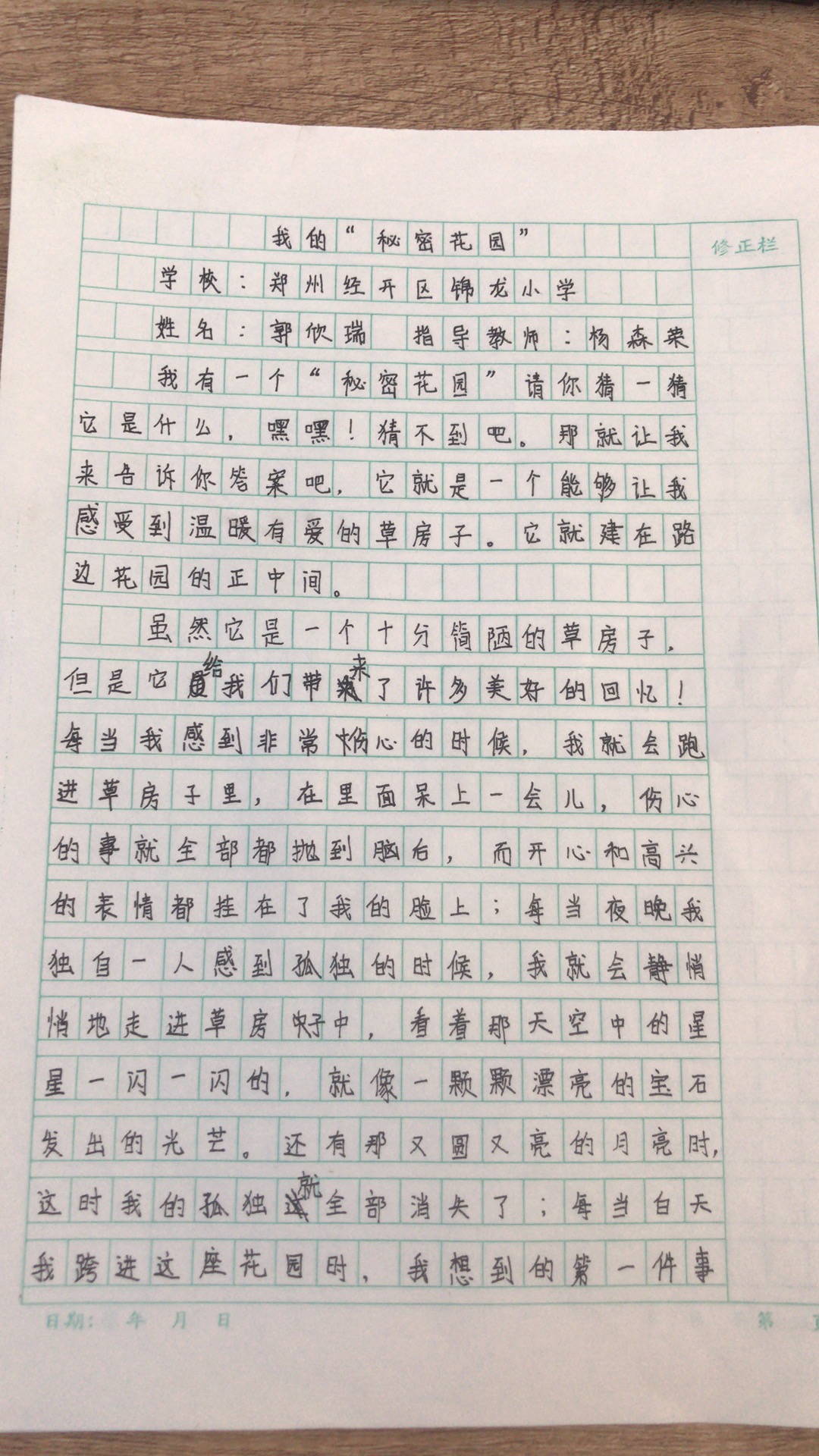 | 以调皮的问句,把人引入了深思。写出了自己的秘密花园——小草房的神秘之功能,可以让自己忘却烦恼,拥有快乐。文章结构完整,表达意思明白。语言生动活泼,透漏出了你的烦恼与快乐。很棒哟! |