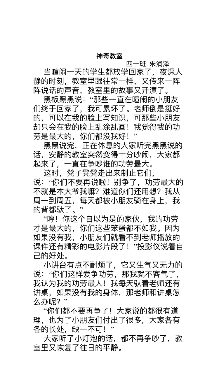 小作者想象力非常丰富,借助黑板、椅子、讲台、投影仪、小灯泡的对话,讲述了教室里发生的争吵,语言生动活泼,贴近儿童生活,结尾升华主题,很有新意。