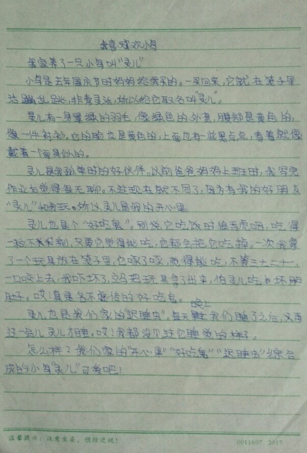 | 小作者在生活中是个细心人,从自己的直观感受出发,不仅写出了对小鸟“灵儿”外形特点的把握,还从生活中的点滴细节表达了对小鸟的喜爱。作品观察认真,感情真挚,是一篇佳作! |