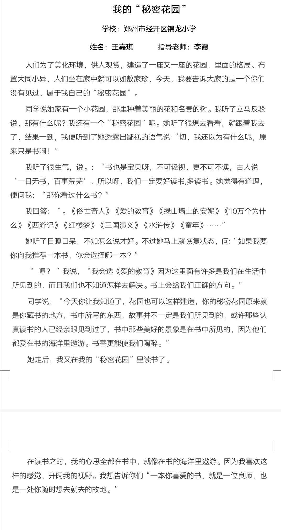 一本你喜爱的书,就是你的朋友,也是你的家。作文行文流畅,语言优美,你的秘密花园令人神往。希望你永远珍爱自己的秘密花园,永远做一个爱读书的女孩儿。腹有诗书气自华,未来可期!