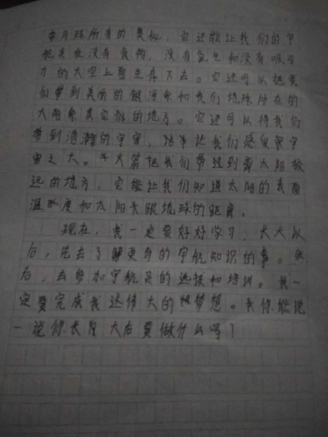 这篇文章语句通顺,表达流畅,富含科学知识,可见你对太空的向往是真实并热切的,有理想,并时刻不忘为之努力,你一定会成功!志存高远,脚踏实地,加油!