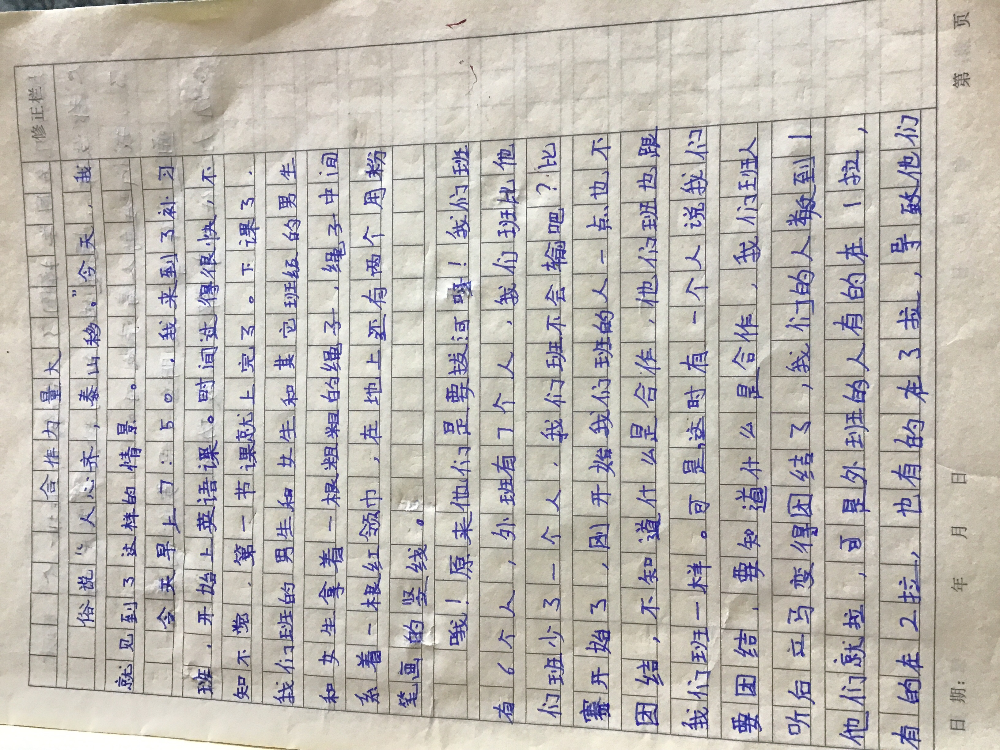 (2) 今天早上7:50,我来到了补习班,开始上英语课。时间过的很快,不知不觉,第一节课就上完了。下课了,我们班的男生和女生和其他班的男生和女生拿着一根粗粗的绳子,绳子中间系着一条红领巾,在地上还有两个用粉笔画的竖线。 眉批:前两段没有押题。