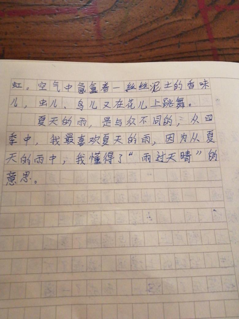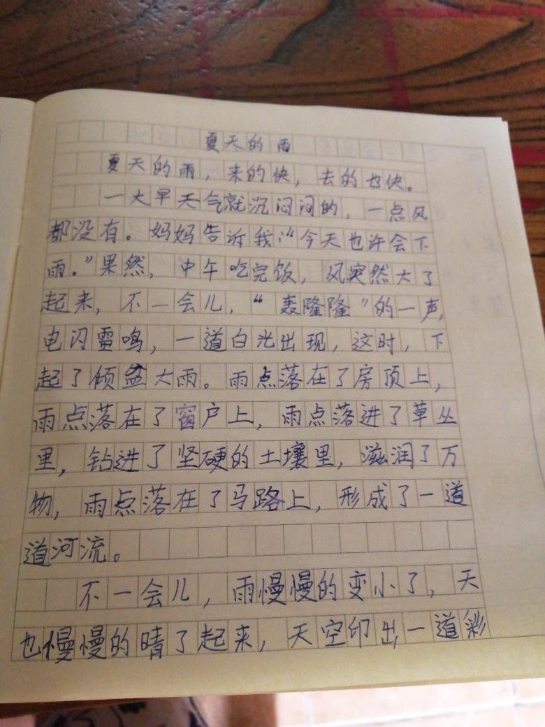 | 开门见山,说明夏天的雨的特点。用表示时间变化的词,描述夏天的雨的变化。用拟声词衬托大雨的气势。这些表明你是一个热爱观察生活的孩子。末尾点题,而且意味深长,有点哲理性小散文的蕴味。如果,能用文字代替图片,你的能力会有新的提升。加油! |
