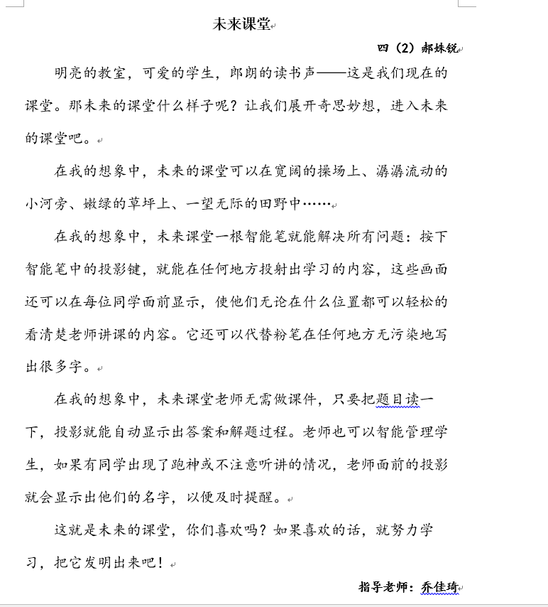 指导老师:乔佳琦 所属学校:华中师范大学附属高新区荣邦城小学