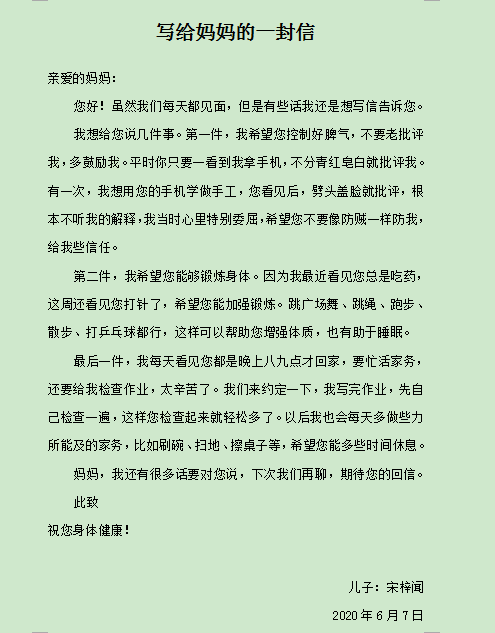 | 这是小作者写给妈妈的一封信,内容朴实,感情真挚,读起来很容易产生共鸣。字里行间都洋溢着对妈妈的爱和关心,以及自己要努力进取减轻妈妈负担的上进心。是个诚实而又善良的小家伙呀! |