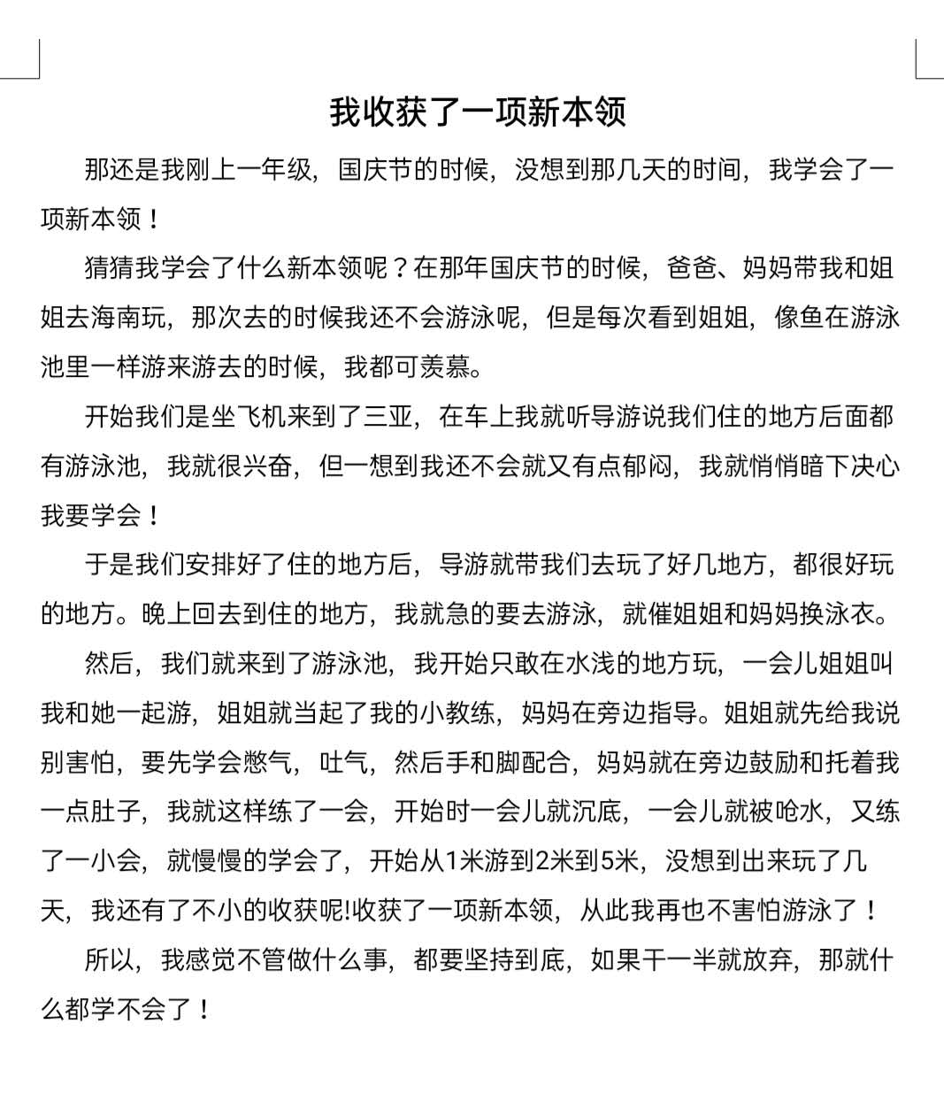 | 开篇点题,紧扣题目。语言干净简洁,叙事生动具体。不但能够细致地写出自己是如何学会这项新本领的,而且写出了自己学习过程中的心理变化。结尾呼应开头,总结全文,再次点明主题。结构严谨,思路清晰。 |
