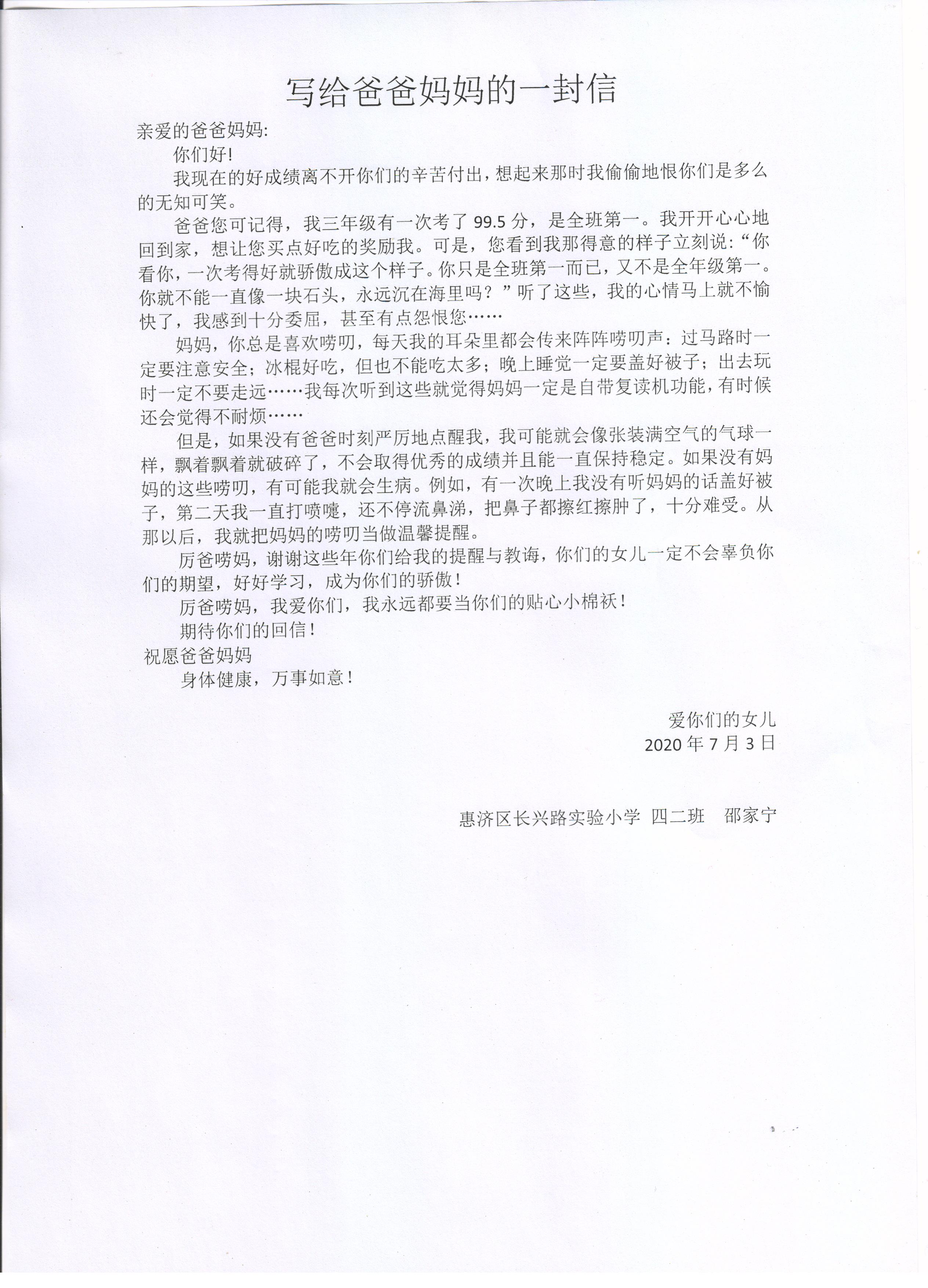 | 字里行间让人感受到你真的懂事了,成长了!你的厉爸唠妈一定为你而感到骄傲!你的信里的具体事例让人感受到你的父母对你深沉的爱和细心的培养,字里行间也流露着真情!感情真挚,难能可贵! |