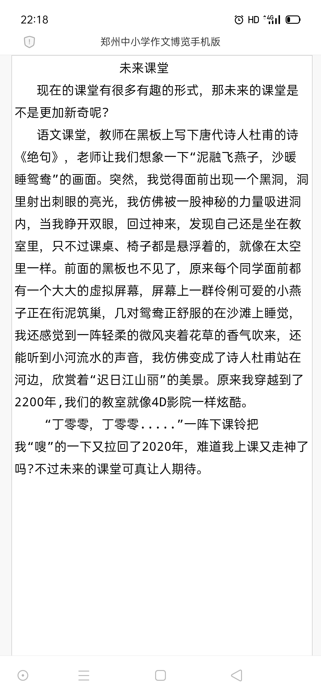 (11) “丁零零,丁零零…。。”一阵下课铃声把我“嗖”的一下又拉回了2020年,难道我上课又走神了吗?不过未来的课堂可真让人期待。 眉批:书面语积累不够