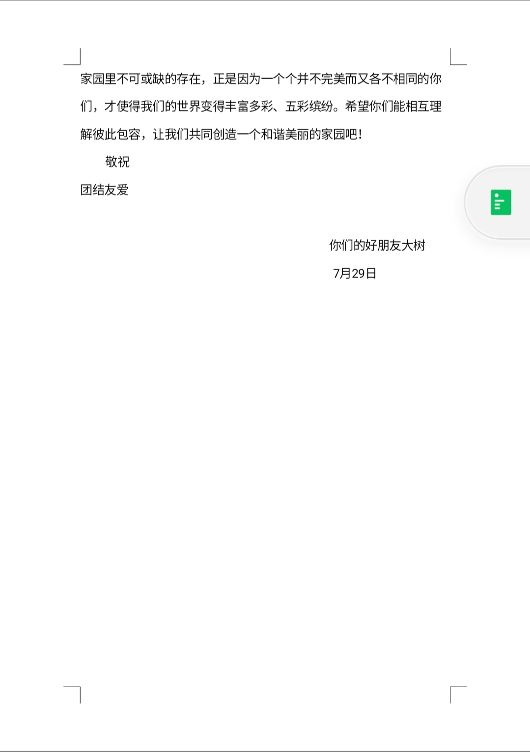 (5) 最后,我想说“金无足赤,人无完人”,每一个个体都是我们这个大家园里不可或缺的存在,正是因为一个个并不完美而又各不相同的你们,才使得我们的世界变得丰富多彩、五彩缤纷。希望你们能相互理解彼此包容,让我们共同创造一个和谐美丽的家园吧!