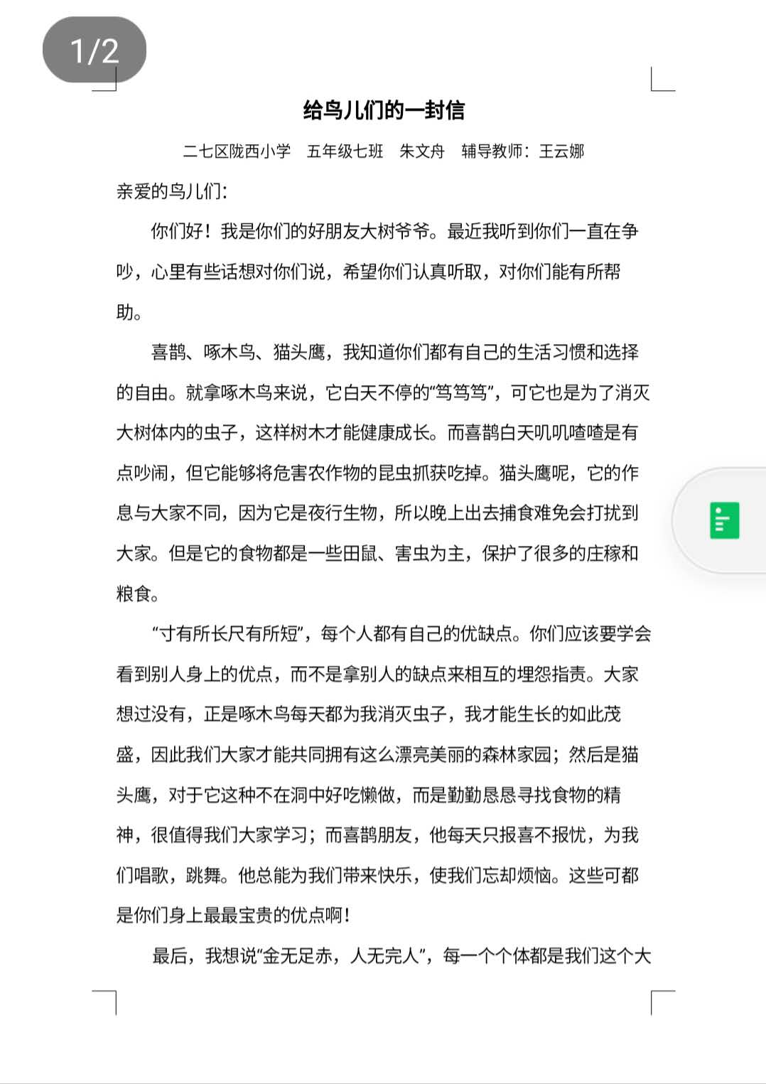 (4) “寸有所长尺有所短”,每个人都有自己的优缺点。你们应该要学会看到别人身上的优点,而不是拿别人的缺点来相互的埋怨指责。大家想过没有,正是啄木鸟每天都为我消灭虫子,我才能生长的如此茂盛,因此我们大家才能共同拥有这么漂亮美丽的森林家园;然后是猫头鹰,对于它这种不在洞中好吃懒做,而是勤勤恳恳寻找食物的精神,很值得我们大家学习;而喜鹊朋友,他每天只报喜不报忧,为我们唱歌,跳舞。他总能为我们带来快乐,使我们忘却烦恼。这些可都是你们身上最最宝贵的优点啊! 眉批:留心周围事物,内容描述有场景感。