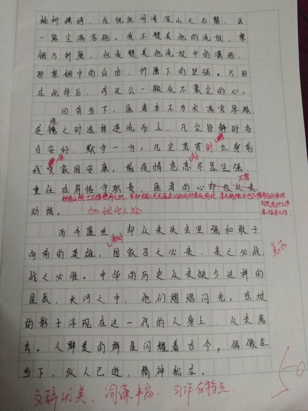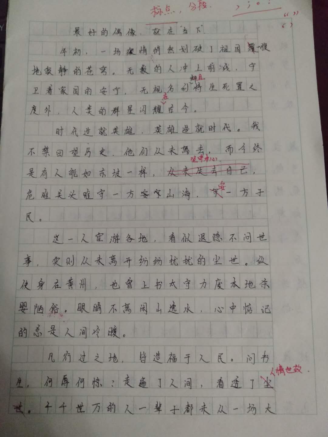 文章的结构简洁合理,作者对偶像的理解也十分深刻透彻。穷则独善其身,达者兼济天下的苏轼;逆流而上、不求高官厚禄的钟南山院士,这些都告诉我们,历史长河中,为人民作出贡献的人才是真正的偶像。全文语言流畅,行文舒展自如,自然洒脱,称得上是一篇较成功的之作,读来令人热血沸腾,心潮澎湃。
