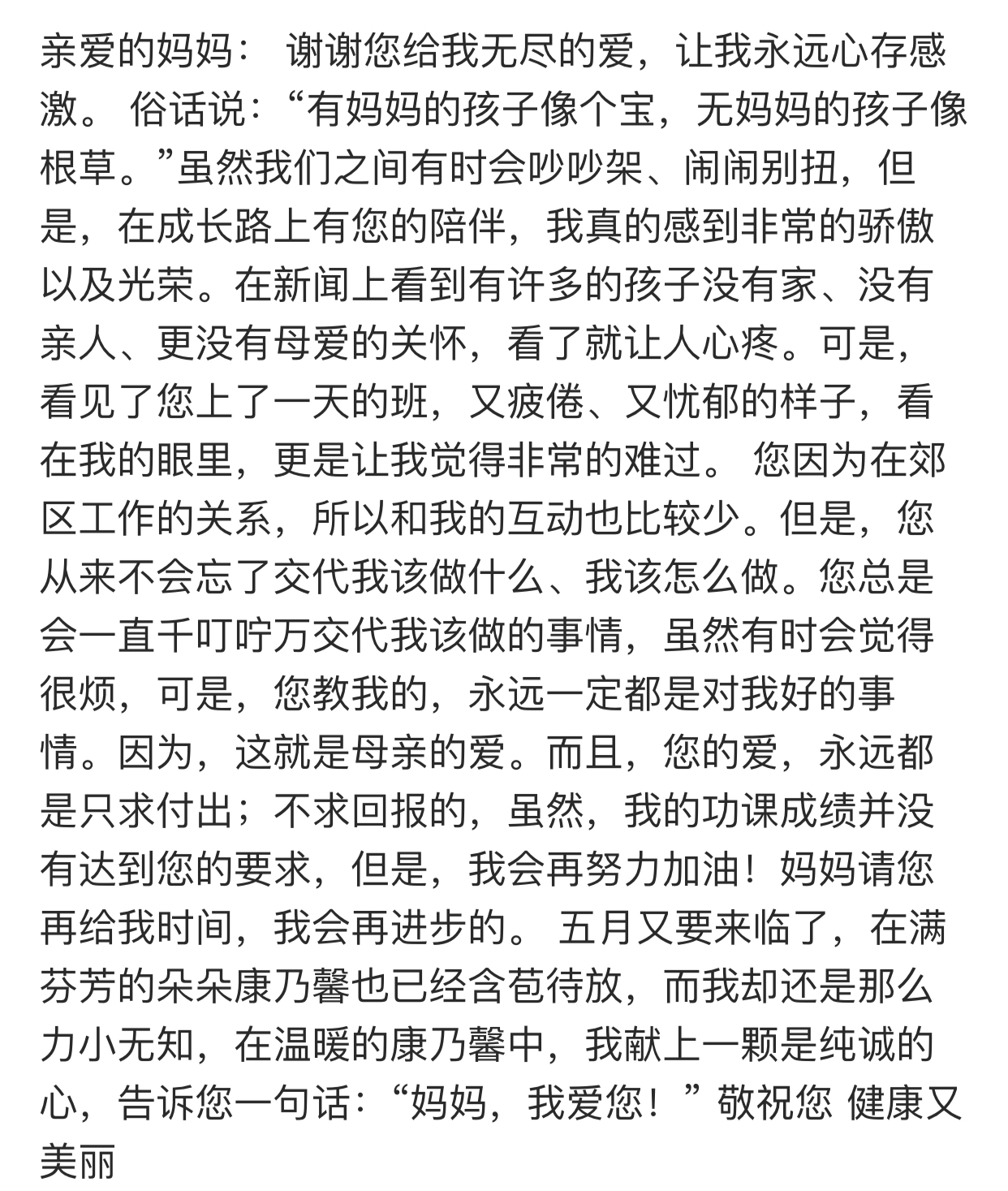 | 你是个懂事善解人意人意姑娘,一字一句中展现了你对妈妈的爱。我们经常会从优秀的文章中感受到:具体的事例可以展现一个人物的特点,人物形象更加鲜明,让读者对人物更了解。 |