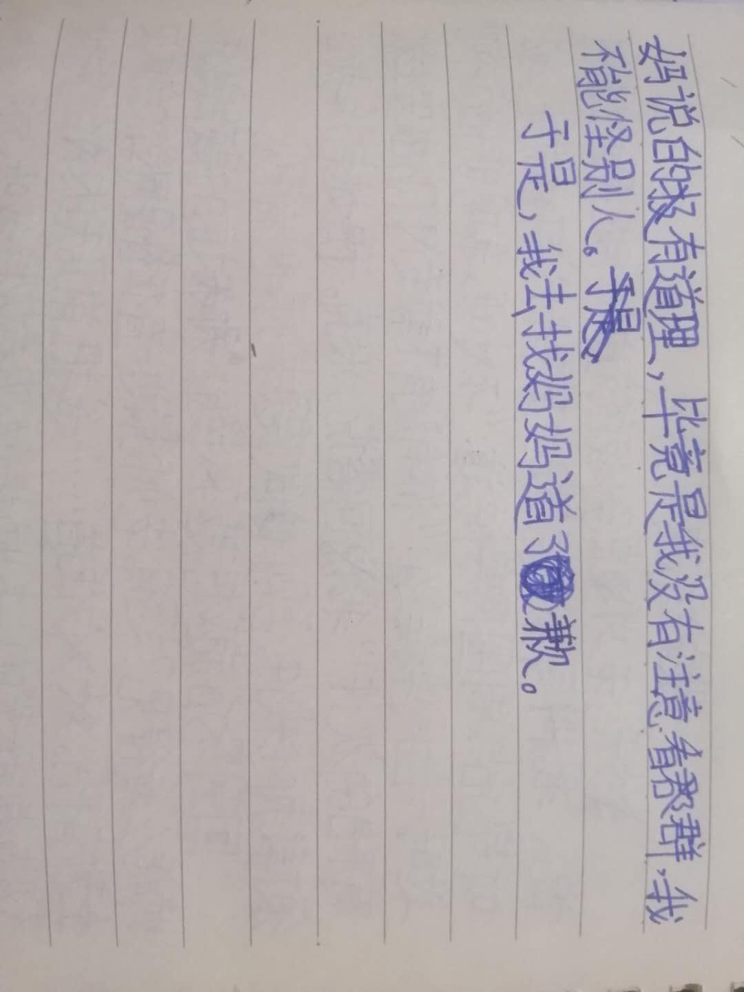 (4) 做完后,我开始向妈妈抱怨:“妈妈,你不是打印了特色作业吗,你难道没有看到老师在群里发我没做安全教育平台吗?”“你自己天天看手机不看群还说我?”妈妈怼道。 眉批:留心周围事物,内容描述有场景感。