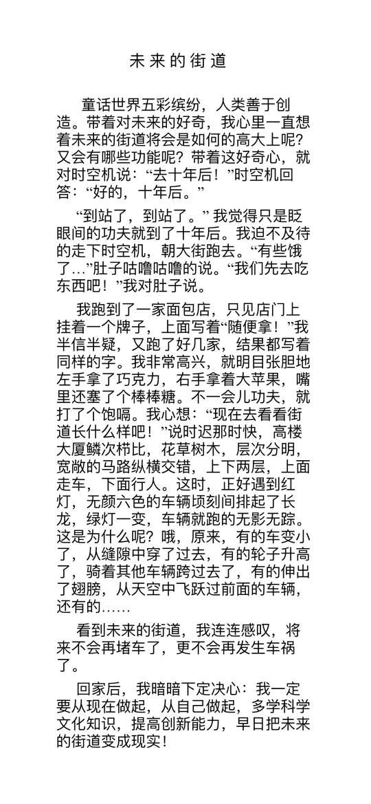 (1) 童话世界五彩缤纷,人类善于创造。带着对未来的好奇,我心里一直想着未来的街道将会是如何的高大上呢?又会有哪些功能呢?带着这好奇心,就对时空机说:“去十年后!”时空机回答:“好的,十年后。” 眉批:开头即点明中心,中间部分才好围绕中心展开。