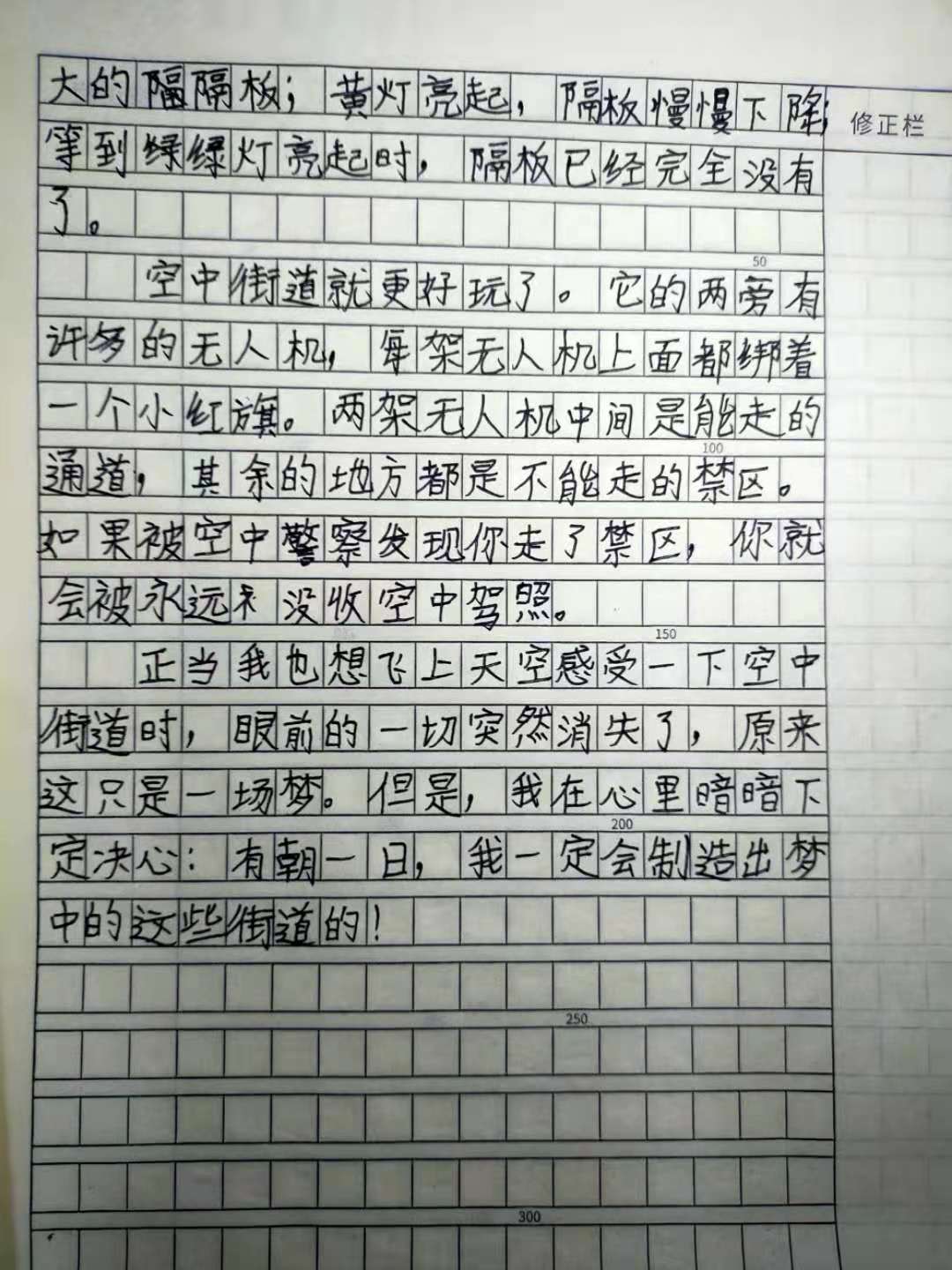 (6) 正当我也想飞上天空感受一下空中街道时,眼前的一切突然消失了,原来这只是一场梦。但是,我在心里暗暗下定决心:有朝一日,我一定会制造出梦中的这些街道的! 眉批:词不离句,句不离题,此处对明确题意起到了很好的作用。