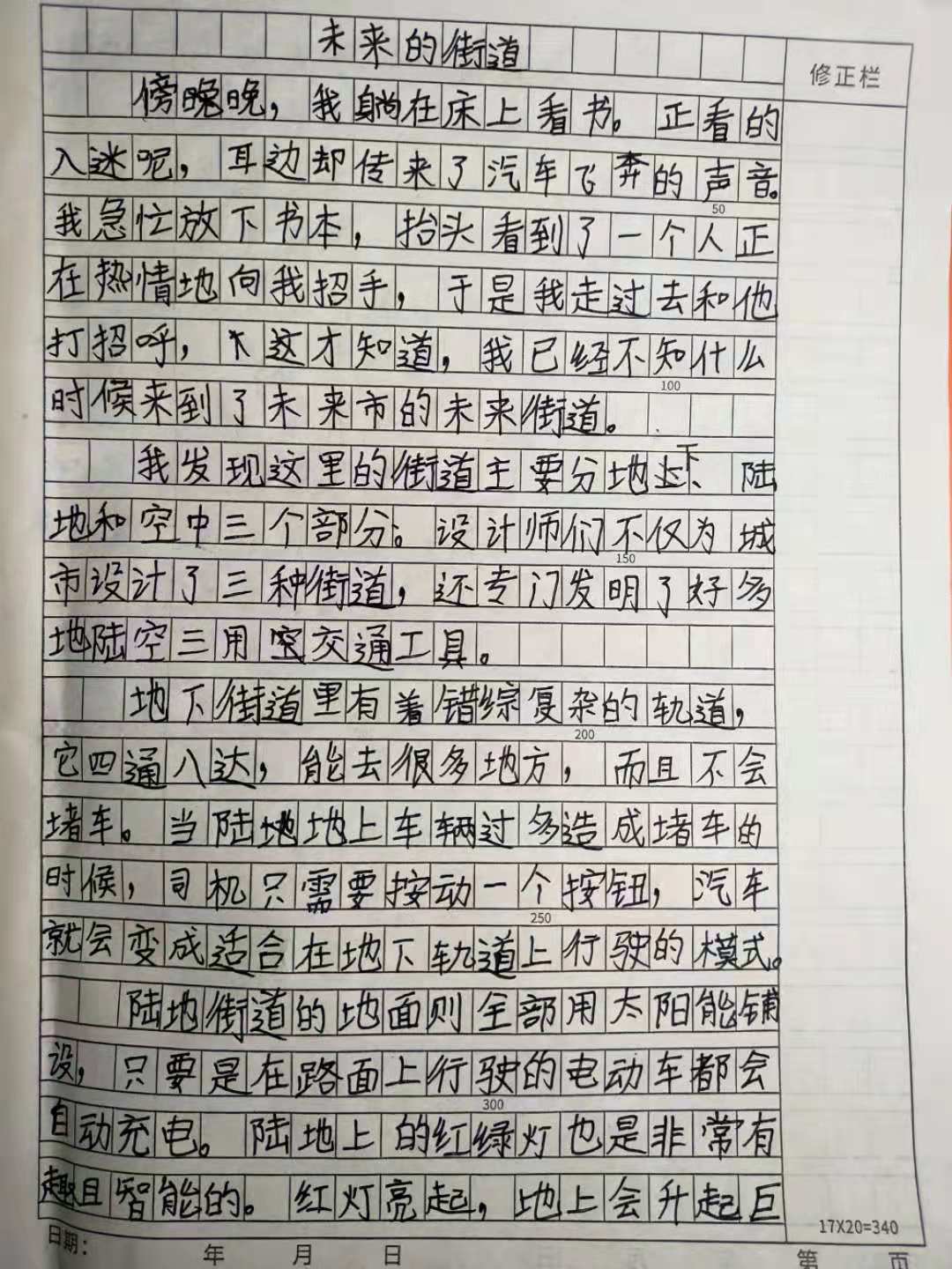 (1) 傍晚,我躺在床上看书。正看的入迷呢,耳边却传来了汽车飞奔的声音。我急忙放下书本,抬头看到了一个人正在热情地向我招手,于是我走过去和他打招呼,这才知道,我已经不知道什么时候来到了未来市的未来街道。 眉批:开门见山,眉目清楚,不错!
