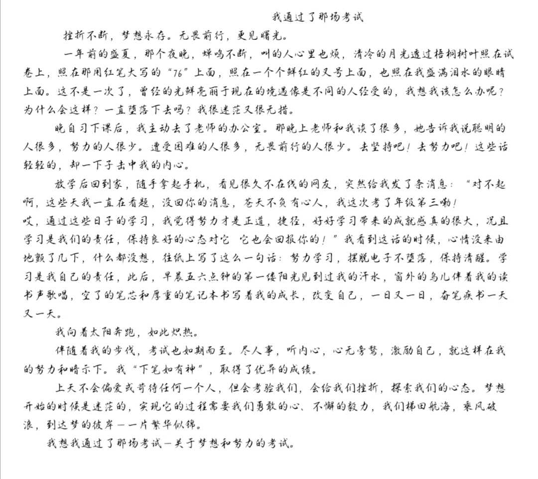 | 文章通过记叙自己在某次不如意的考试后去找老师谈话以及和网友的经历进行对比后内心有了触动,这一部分的语言描写诗意中带着力量,写得较好;但是结尾相对而言比较仓促和上文的衔接比较薄弱,望注意。 |