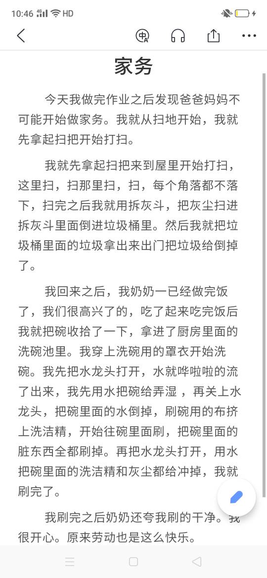(2) 今天我做完作业之后发现爸爸妈妈不可能开始做家务。我就从扫地开始,我就先拿起扫把开始打扫。 眉批:前两段没有押题。