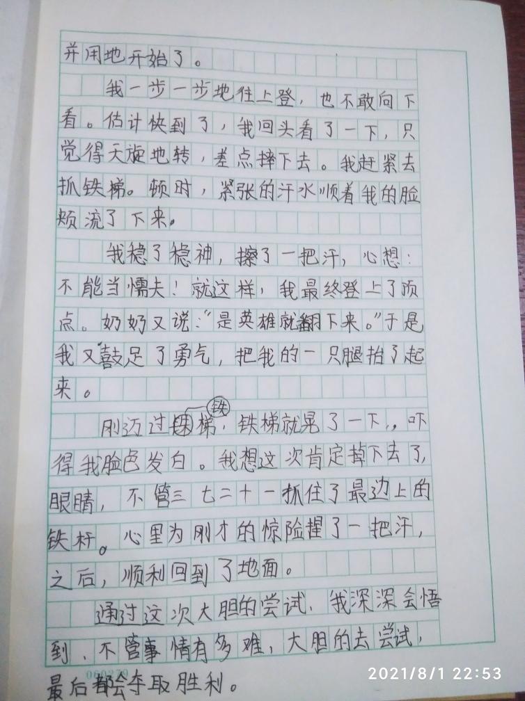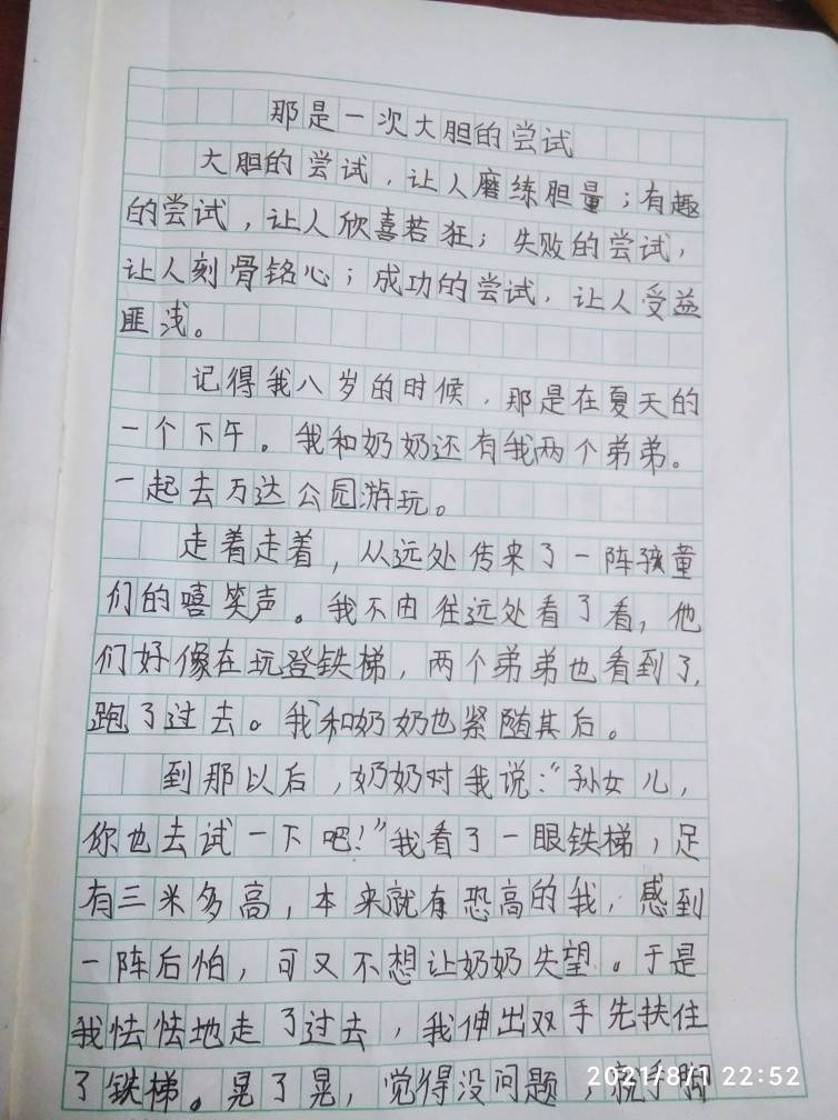 此篇文章,写出了自己亲身经历过的大胆尝试,和自己表情变化,以及内心斗争。整篇语句通顺,收尾相接,写得很好。望你今后多读多看,继续努力多发表文章,让更多的文采爱好者,点评意见。
