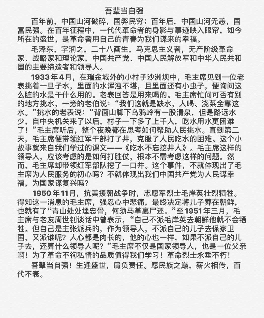 以民族崛起富强为己任,以发展国家强大为使命,这是每一个少先队员应该有的觉悟和自知。希望以历代英雄为榜样,薪火相传,让中国的旗帜插遍世界每一个角落。