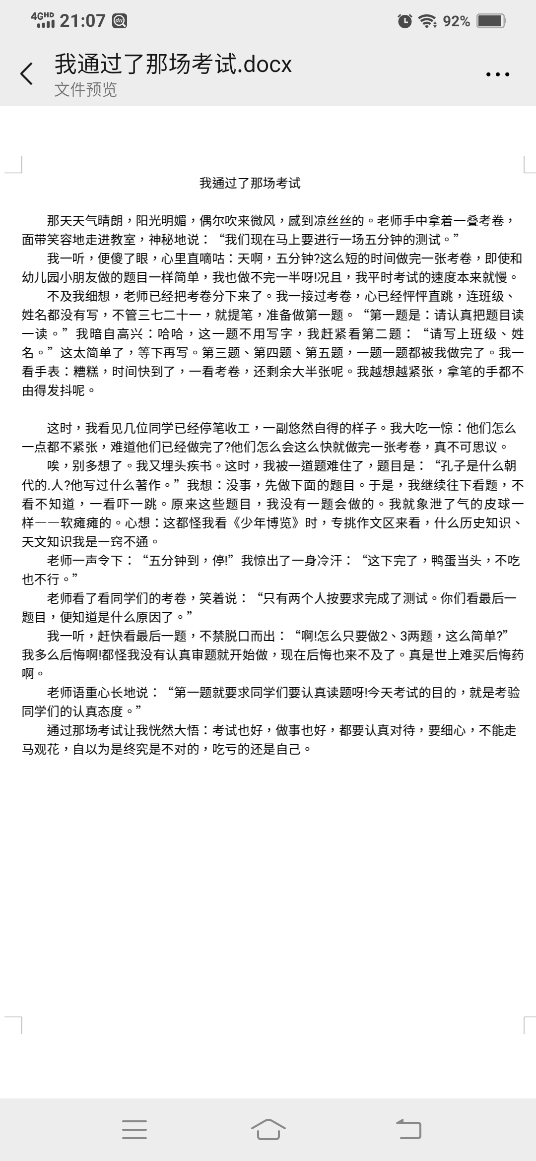 (2) 那天天气晴朗,阳光明媚,偶尔吹来微风,感到凉丝丝的。老师手中拿着一叠考卷,面带笑容地走进教室,神秘地说:“我们现在马上要进行一场五分钟的测试。”我一听,便傻了眼,心里直嘀咕:天啊,五分钟?这么短的时间做完一张考卷,即使和幼儿园小朋友做的题目一样简单,我也做不完一半呀!况且,我平时考试的速度本来就慢。不及我细想,老师已经把考卷分下来了。我一接过考卷,心已经怦怦直跳,连班级、姓名都没有写,不管三七二十一,就提笔,准备做第一题。“第一题是:请认真把题目读一读。”我暗自高兴:哈哈,这一题不用写字,我赶紧看第二题:“请写上班级、姓名。”这太简单了,等下再写。第三题、第四题、第五题,一题一题都被我做完了。我一看手表:糟糕,时间快到了,一看考卷,还剩余大半张呢。我越想越紧张,拿笔的手都不由得发抖呢。这时,我看见几位同学已经停笔收工,一副悠然自得的样子。我大吃一惊:他们怎么一点都不紧张,难道他们已经做完了?他们怎么会这么快就做完一张考卷,真不可思议。唉,别多想了。我又埋头疾书。这时,我被一道题难住了,题目是:“孔子是什么朝代的。人?他写过什么著作。”我想:没事,先做下面的题目。于是,我继续往下看题,不看不知道,一看吓一跳。原来这些题目,我没有一题会做的。我就象泄了气的皮球一样――软瘫瘫的。心想:这都怪我看《少年博览》时,专挑作文区来看,什么历史知识、天文知识我是―窍不通。老师一声令下:“五分钟到,停!”我惊出了一身冷汗:“这下完了,鸭蛋当头,不吃也不行。”老师看了看同学们的考卷,笑着说:“只有两个人按要求完成了测试。你们看最后一题目,便知道是什么原因了。”我一听,赶快看最后一题,不禁脱口而出:“啊!怎么只要做2、3两题,这么简单?”我多么后悔啊!都怪我没有认真审题就开始做,现在后悔也来不及了。真是世上难买后悔药啊。老师语重心长地说:“第一题就要求同学们要认真读题呀!今天考试的目的,就是考验同学们的认真态度。”通过那场考试让我恍然大悟:考试也好,做事也好,都要认真对待,要细心,不能走马观花,终究是不对的,吃亏的还是自己,经过不断的努力最终通过了那场考试。 眉批:基本符合题目要