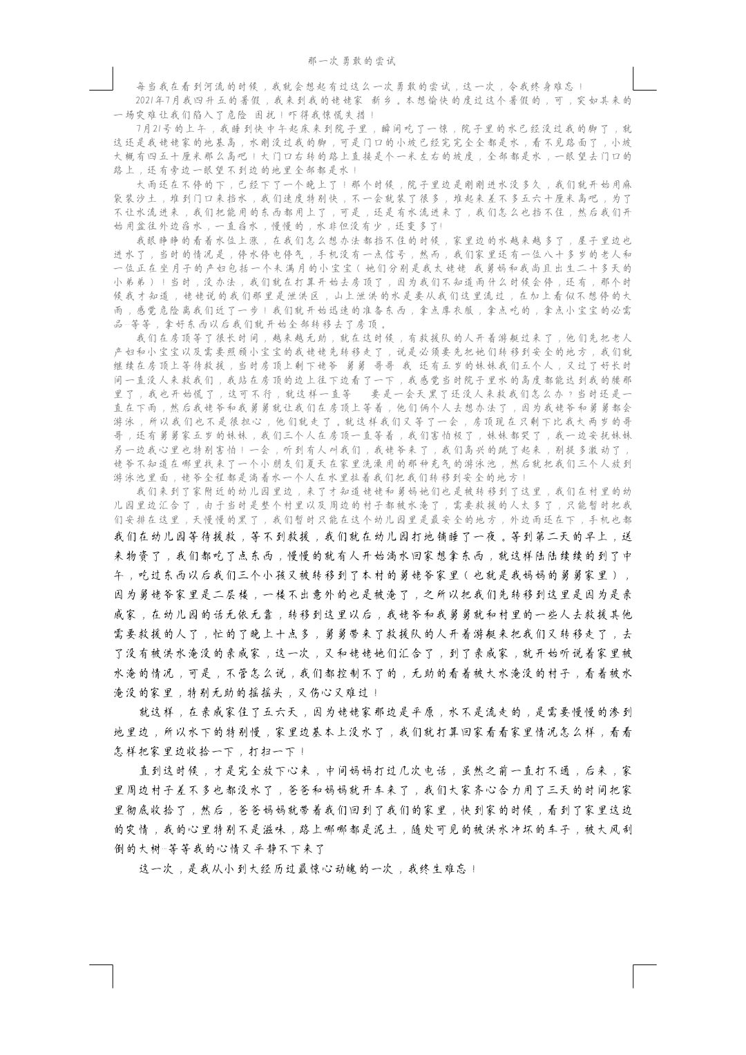 作文写的很真实,如果能紧扣“尝试”来展开情节,作文中心会更突出。作文中,转述句太多,语言、动作等细节描写有些少。再修改一下,会是一篇非常优秀的作品。
