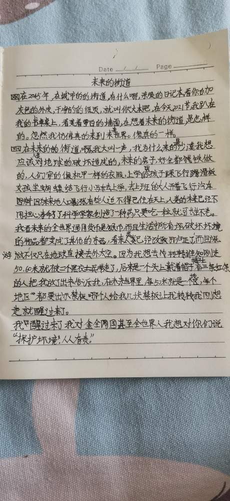 (1) 在2045年,在城市的街道有什么哪?亲爱的日记本,看你白加灰色的外皮,干净的纸页,就叫你大本吧。在今天的2021年我趴在我的书桌上。看着雪白的墙面,在想着未来的街道是怎样的!忽然我仿佛真的来到未来世界,像真的一样。 眉批:首句就押题,很好。