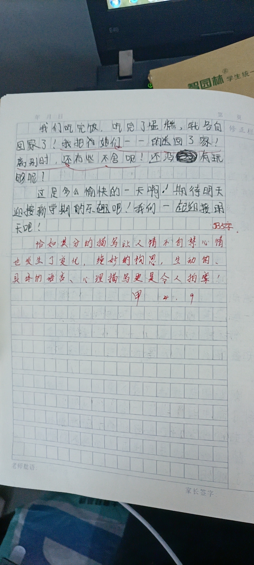 孙悦丹同学能较为生动具体地写了这天发生的事,并运用和恰如其分的修辞手法和生动的语言,表现了她的基本功还是很扎实的!