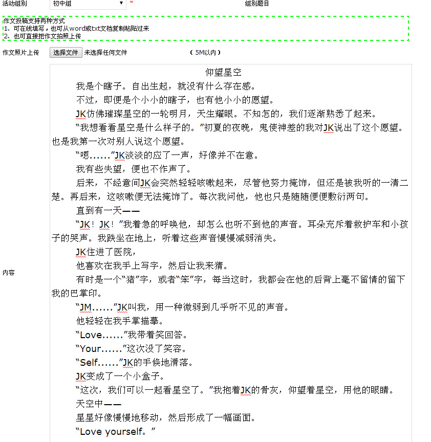 版权说明: A类权限 我谨保证我是此作品的著作权人,并且此作品系首发于郑州教育信息网作文博览频道。我同意郑州教育信息网作文博览频道作为此作品版权的独占代理人。在撤销本委托之前,我不再将此作品投给其他媒体,有关此作品发表和转载等任何事宜,由郑州教育信息网作文博览频道全权负责。未经郑州教育信息网作文博览频道转授权,其他媒体一律不得转载。 |