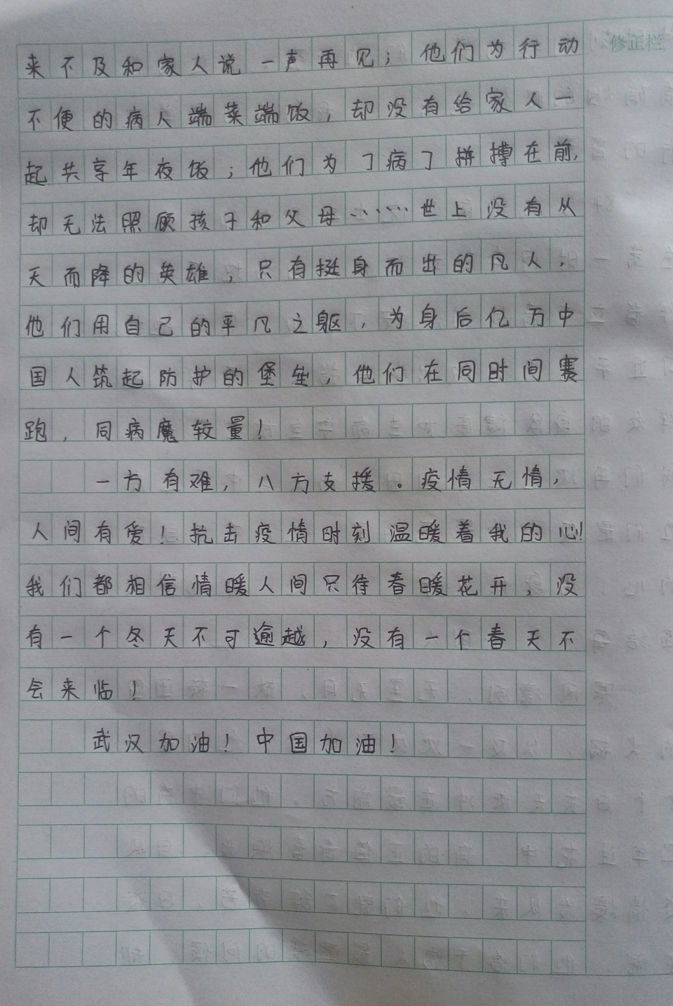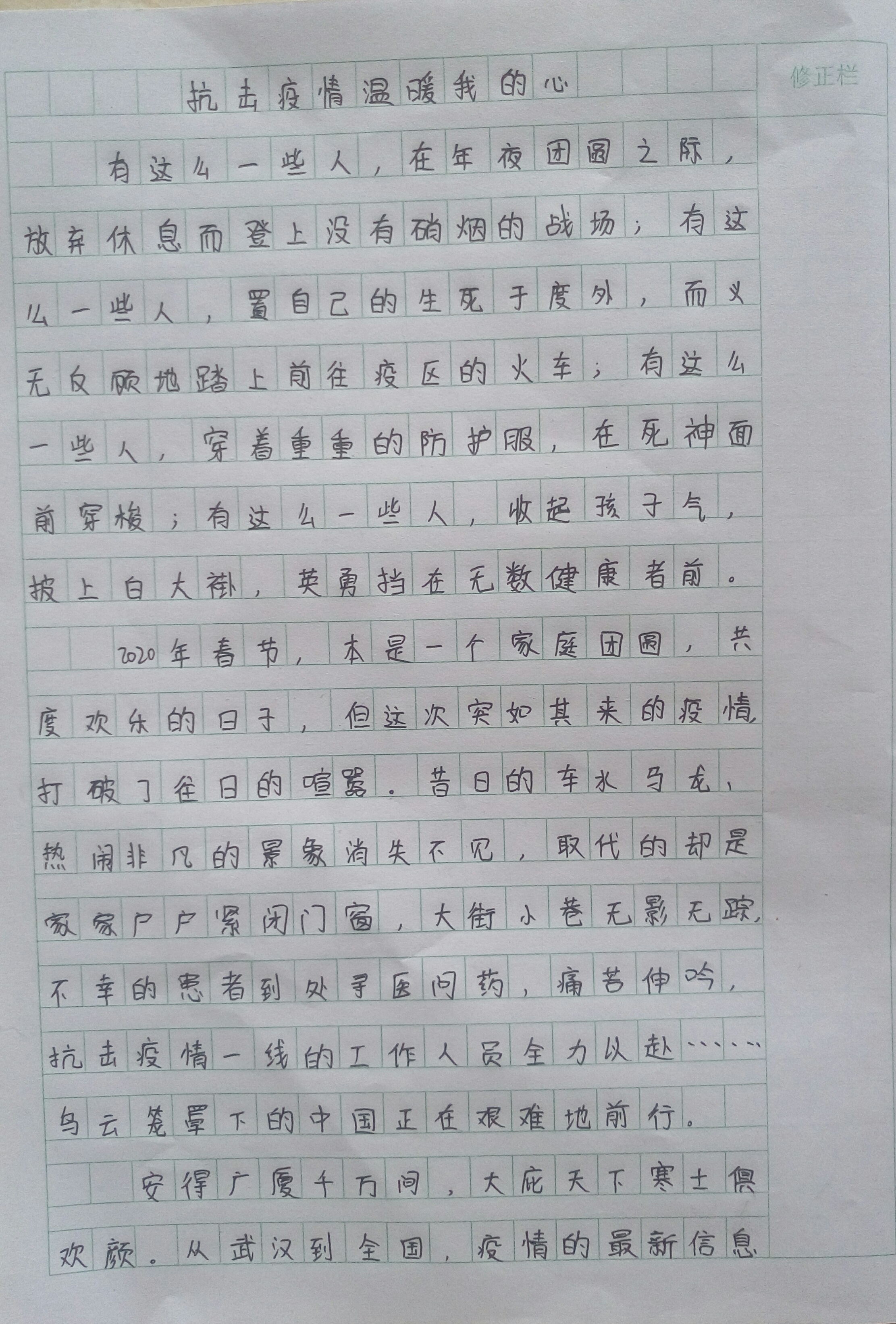 抗击疫情温暖我的心 热1156 类别:抒情 发表时间:2020-05-31 10:35 已有 1157 次阅读 指导老师:杨雅婷 所属学校:登封市大金店镇第一初级中学