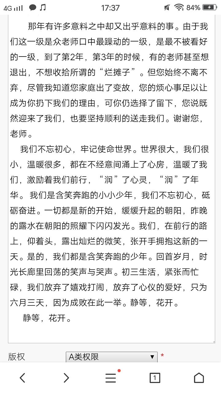 版权说明: A类权限 我谨保证我是此作品的著作权人,并且此作品系首发于郑州教育信息网作文博览频道。我同意郑州教育信息网作文博览频道作为此作品版权的独占代理人。在撤销本委托之前,我不再将此作品投给其他媒体,有关此作品发表和转载等任何事宜,由郑州教育信息网作文博览频道全权负责。未经郑州教育信息网作文博览频道转授权,其他媒体一律不得转载。 |