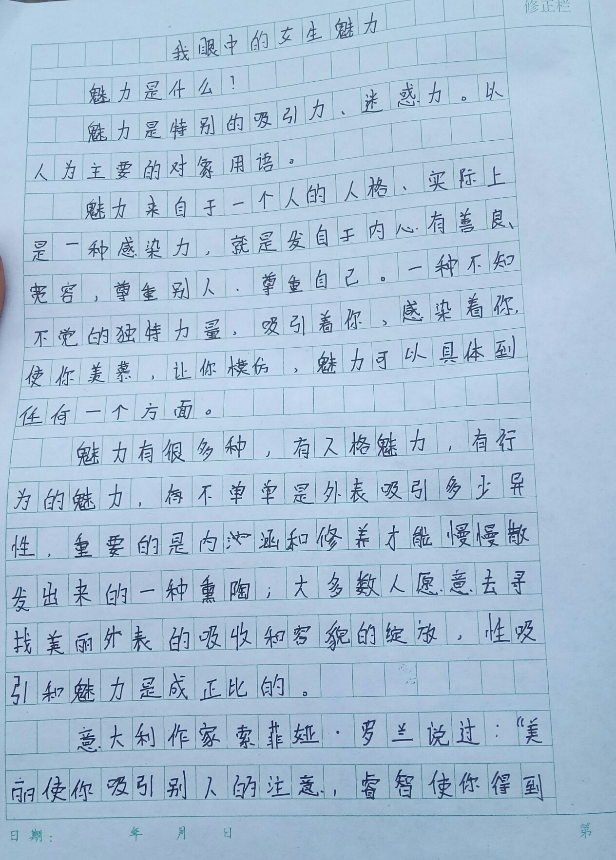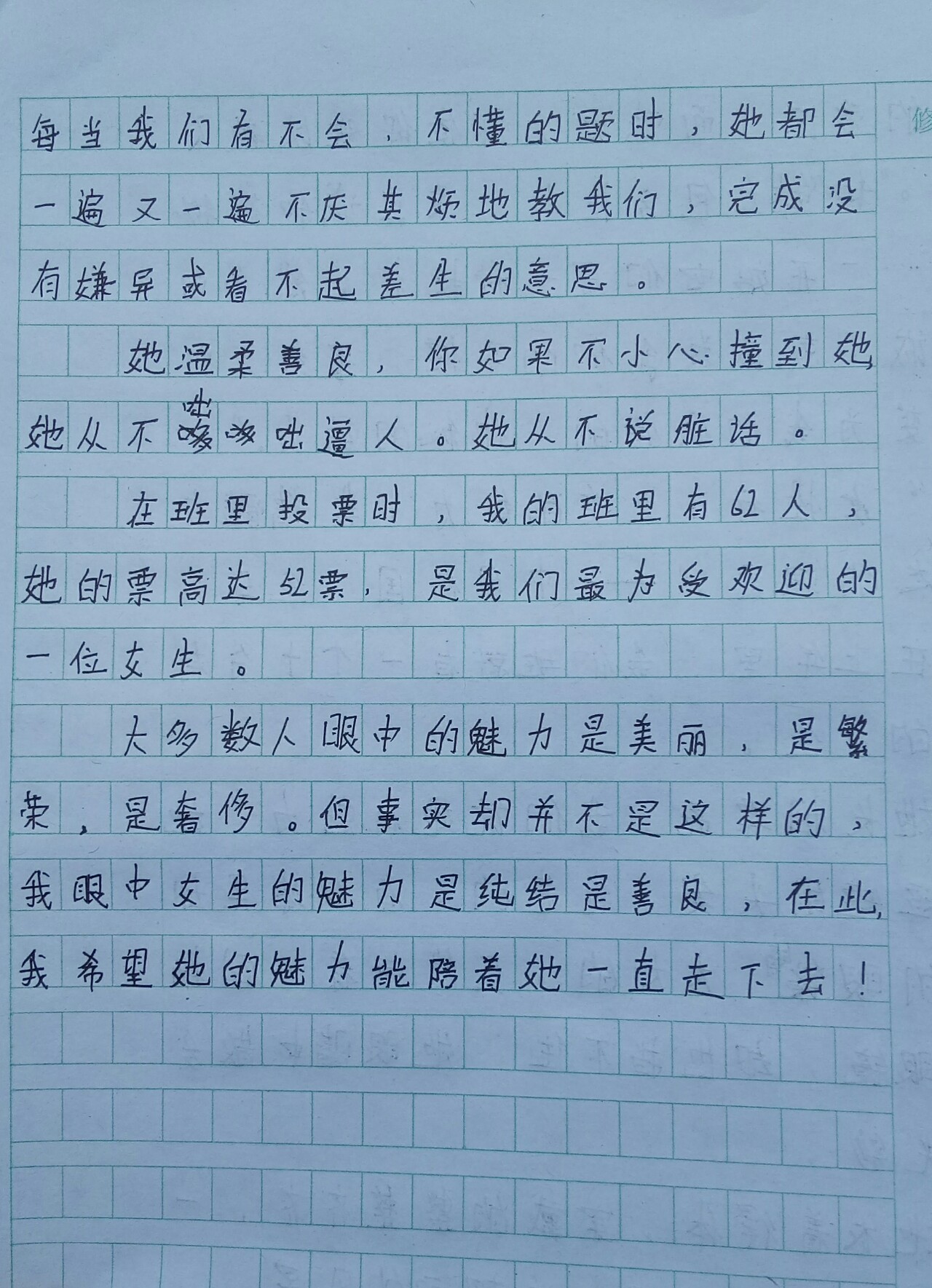 我眼中的女生魅力 热466 类别:写人 发表时间:2018-09-08 15:21 已有 467 次阅读 指导老师:陈晓燕 所属学校:登封市大金店镇第一初级中学