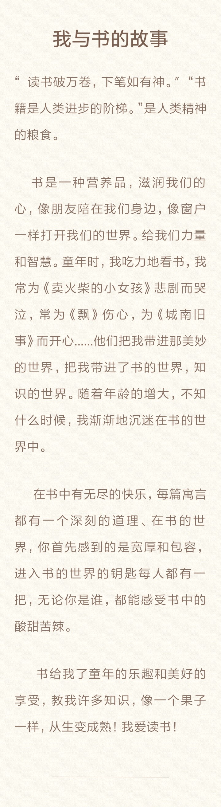 我与书的故事 热664 类别:叙事 发表时间:2017-09-10 16:17 已有 665 次阅读 指导老师:李老师 所属学校:中牟县滨河路小学