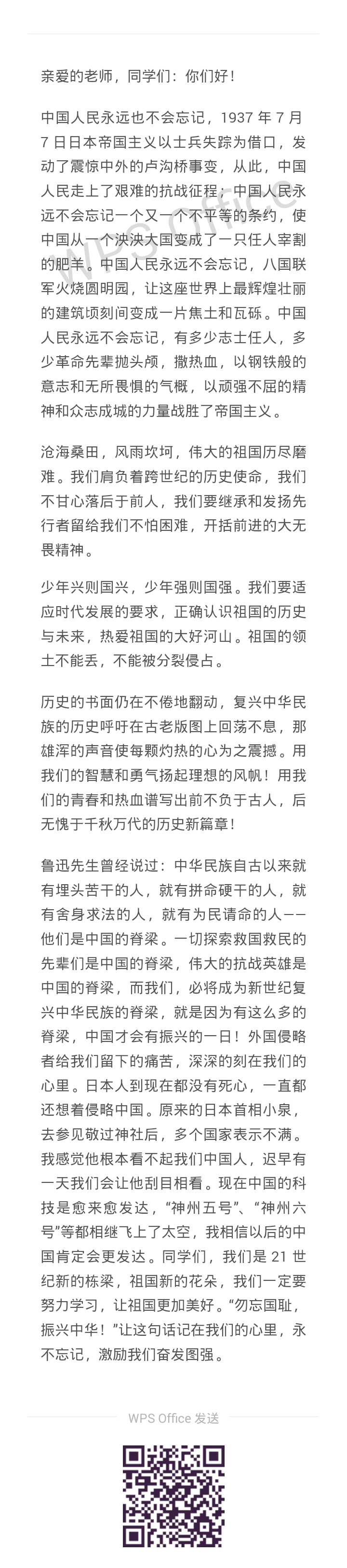 勿忘国耻,振兴中华 热1202 类别:抒情 发表时间:2017-10-27 20:32 已有 1203 次阅读 指导老师:李娟 所属学校:中牟县滨河路小学