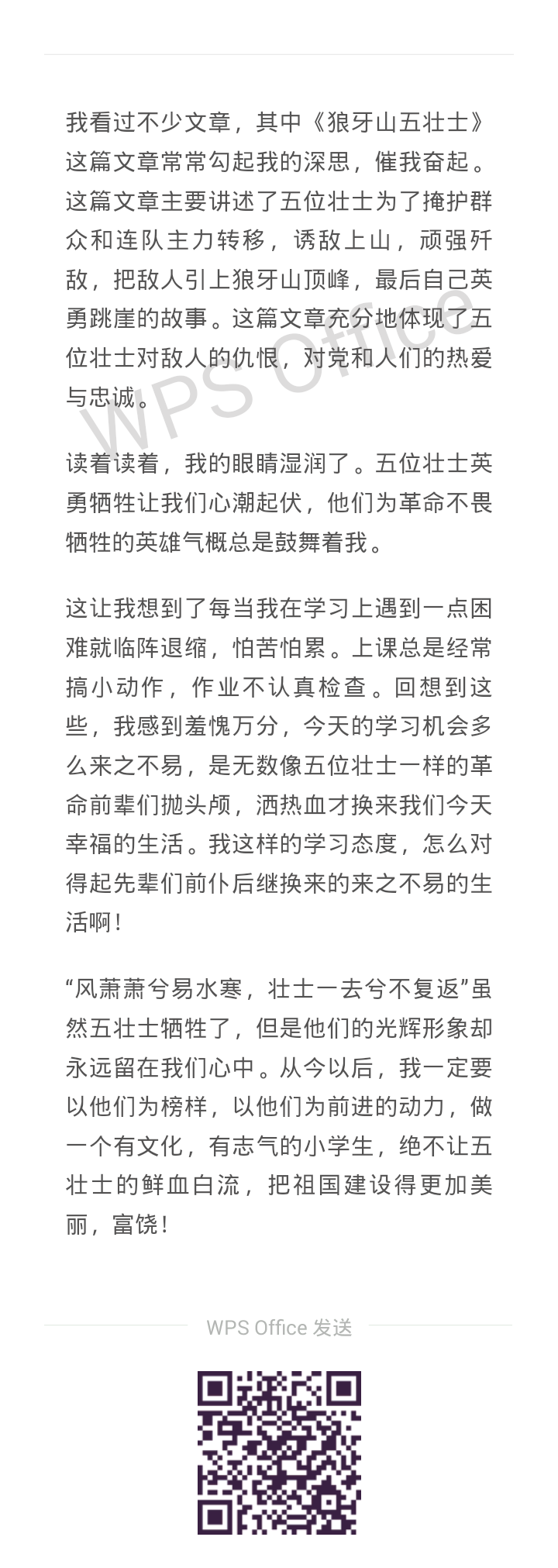读《狼牙山五壮士》有感 热1317 类别:其他 发表时间:2017-12-01 17:16 已有 1318 次阅读 指导老师:李娟 所属学校:中牟县滨河路小学