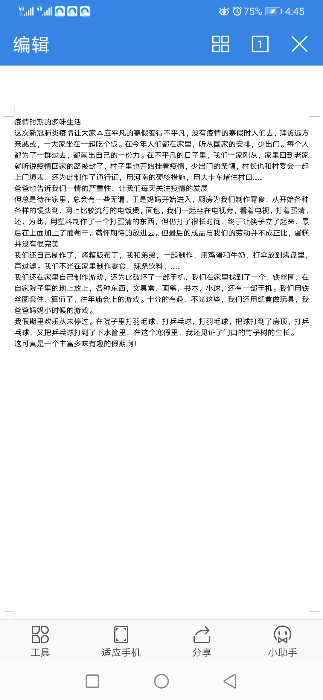 疫情疫情时期的多味生活 热883 类别:记叙 发表时间:2020-06-21 16:56 已有 884 次阅读 指导老师:郑炎楠 所属学校:登封新区中强学校