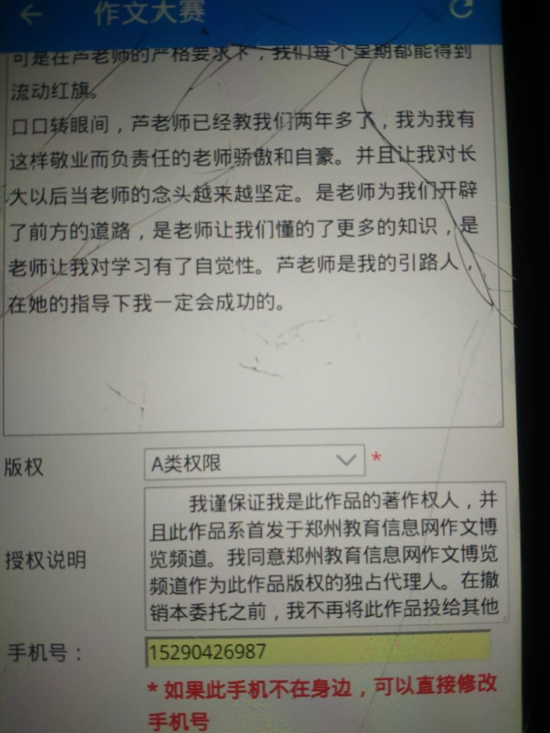 版权说明: A类权限 我谨保证我是此作品的著作权人,并且此作品系首发于郑州教育信息网作文博览频道。我同意郑州教育信息网作文博览频道作为此作品版权的独占代理人。在撤销本委托之前,我不再将此作品投给其他媒体,有关此作品发表和转载等任何事宜,由郑州教育信息网作文博览频道全权负责。未经郑州教育信息网作文博览频道转授权,其他媒体一律不得转载。 |