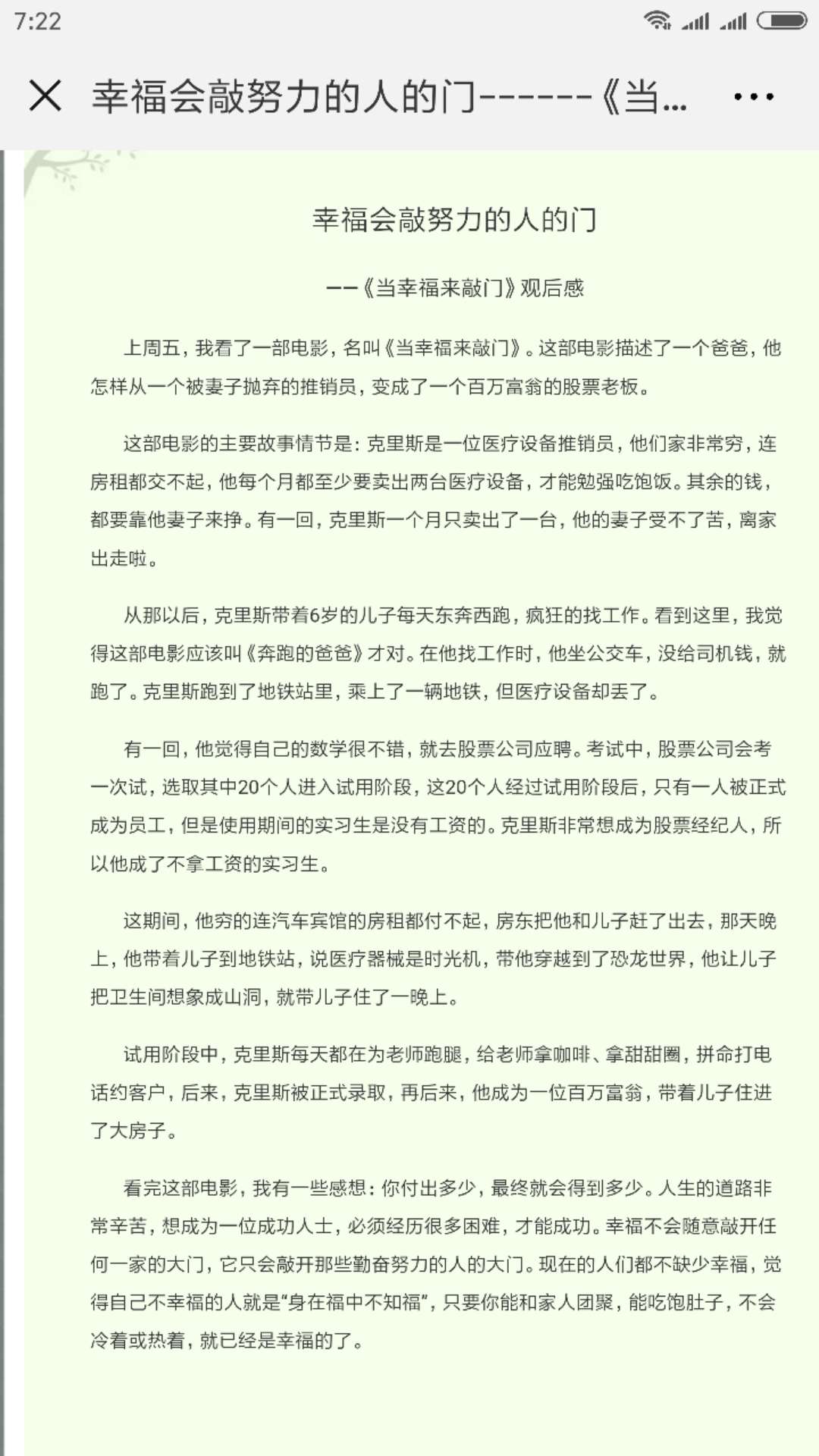 幸福会敲努力的人的门------《当幸福来敲门》观后感 热946 类别:其他 发表时间:2018-08-26 07:26 已有 947 次阅读 指导老师:黄培 所属学校:金水区文化绿城小学