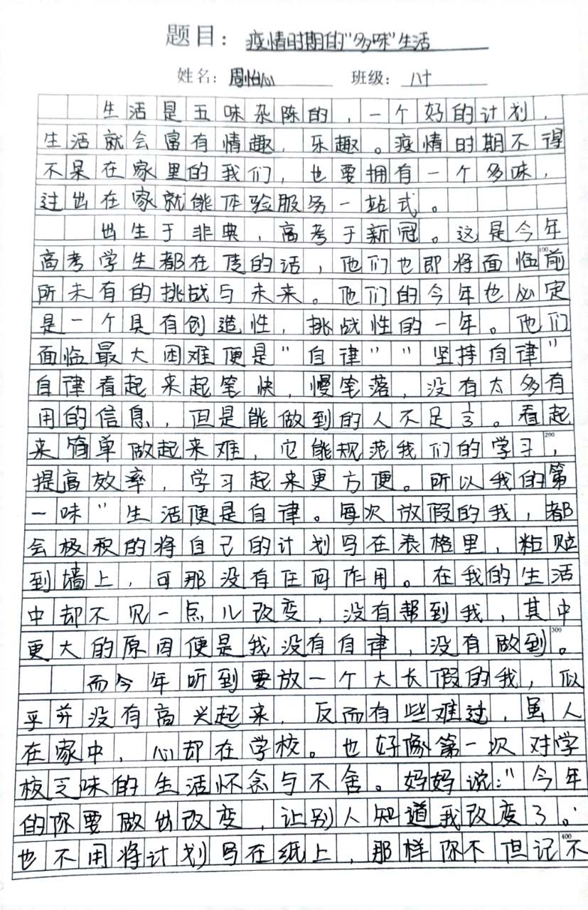 “疫情”时期的“多味”生活 热860 类别:记叙 发表时间:2020-10-16 19:44 已有 861 次阅读 指导老师:赵丽平 所属学校:新密市市直一初中