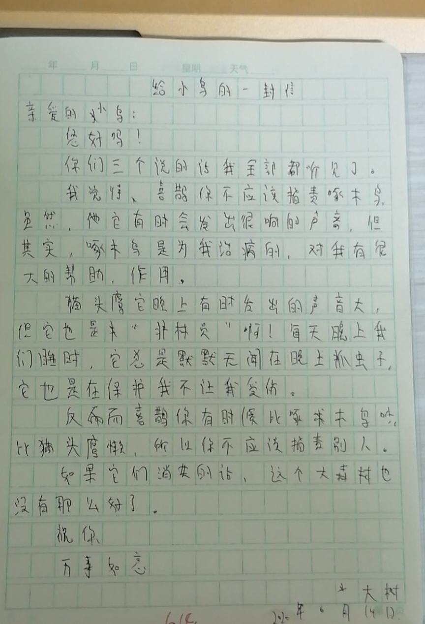 给小鸟的一封信 热458 类别:抒情 发表时间:2020-06-16 09:06 已有 459 次阅读 指导老师:卢巧红 所属学校:新密市实验小学
