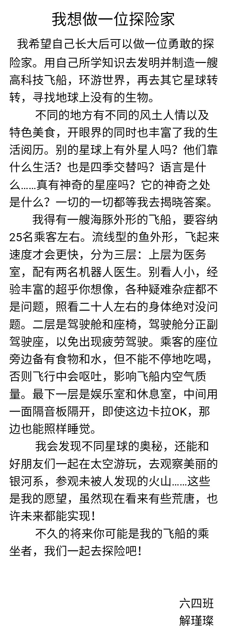 我想做一位探险家 热578 类别:原创 发表时间:2018-10-09 20:46 已有 579 次阅读 指导老师:孙新荣 所属学校:经济技术开发区外国语小学